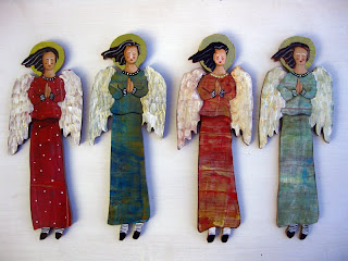 Good News, I have just completed 25 of my 2009 Christmas angel ornaments. I have two styles this year, the flying angel and the angel at prayer. I really enjoyed making them because their dresses have layers and layers of textured paint creating a distressed look. However these angels are not inwardly distressed in the least. I gave them all faces which are at rest and contemplating the goodness that life brings to each of us everyday. Now I realize life is full of ups and downs but goodness is always around us. Question is, are we looking and aware of it’s presence? Blessings abound and it helps to look for them. I’m wondering if you have been looking and where you have found goodness in your own life?