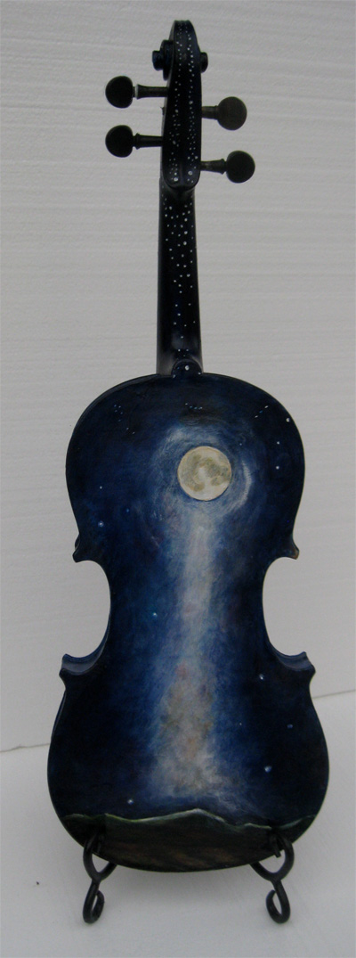 The Helena Symphony is featuring painted violins that will be auctioned off for their 2013 Gyla fundraiser. I was thrilled to be asked to to put my visual interpretation on one of these violins. I choose the music, Clair de Lune, by Claude Debussy as my inspiration. I found a musical score for violin and piano of Clair De Lune and tore it into small pieces which I used to collage the outside of the violin case creating an handsome black and white pattern. Being a romantic at heart I have always been mesmerized by the moon and it’s gentle light that dances across the evening skies. The violin seemed life a perfect form to paint my artistic impressions of the moon’s soft luminosity.