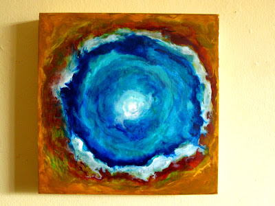 How is this for color? For sure You defiantly can’t miss it. I have used so much red lately that I’m now wondering what kind of results I can get with blue. This particular abstract reminds me of the thermal springs in Yellowstone Park. There is also a sense of depth in this one which happened quit unintentionally. Uncontrolled surprises are the joy’s of painting abstracts. I love them and they have the same affect on me as when I was 10 years old and discovered a magical world of play outdoors on a cool summer evening. I’m so glad that as humans we have the ability to always retain that childlike sense of wonder and awe.