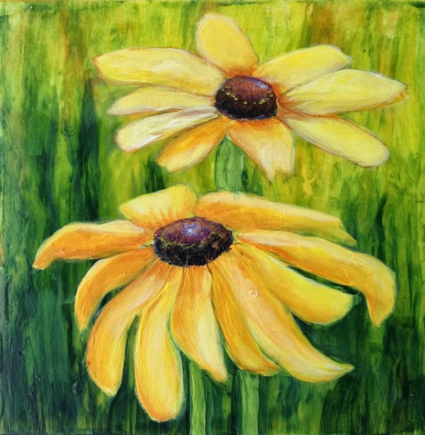 I am keeping up on my challenge of creating 2 paintings a day. It always feels good to accomplish ones goal. Black-Eyed Susans are some of my most favorite garden flowers. There is something about having several shades of yellow against a field of green that warms ones heart. When these appear in my garden I know summer is really here. I also love to watch the bees as they hover over the tops of these flowers searching for pollen.