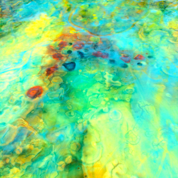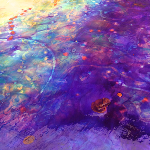 Purples and blues over the aqua and oranges. A total of 12 different layers of paint.