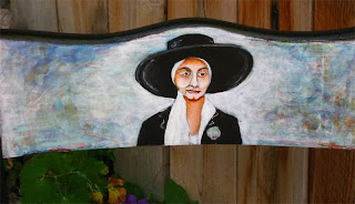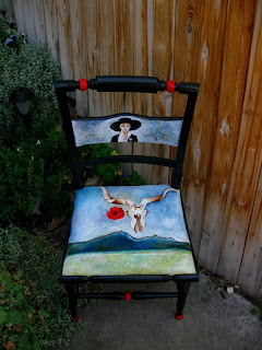My Chair painting is one of many being auctioned off by the Helena Symphony Orchestra in January 2010 to support their upcoming concert series. Artists from the Helena area have used a wide variety of themes, chairs and colors to help the Symphony launch a wonderful fund raiser. I chose Georgia O’Keeffe as my theme for the chair. She is one of my most favorite artists. This piece is my version of her painting , “Rams Head Hollyhock Hills ” Instead of the Santa Fe mountains I painted the mountains that are on the northern edge of the Helena Valley. Georgia would have felt right at home here in Montana with its majestic mountains and big sky.