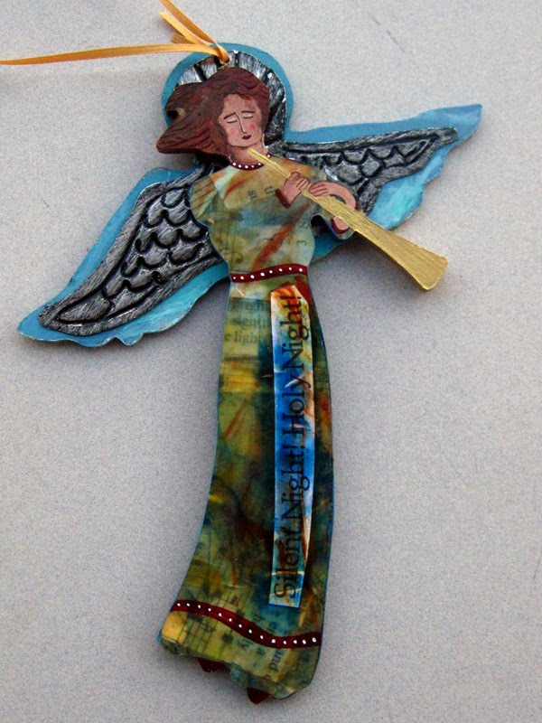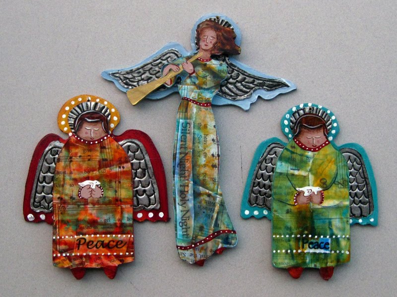 These whimsical angels are a collection of a variety of art elements, paper collage, metal, acrylic paint and wood. The wings and body have been joined together to create a three dimensional object that can easily be hung from tree, window, door or cupboard. The Peace angel measures 6.25″L x 5″ wide. The Silent night Angel measures 9″L x 7″ W