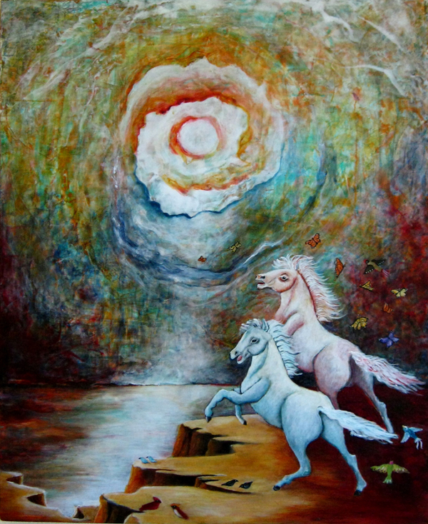 I just finished this commissioned piece for Diane Nagy of Houston, Texas. Diane had a definite vision for this painting that centers on an important friendship she has had in her life, a vision that includes horses, butterflies, birds and a heavenly light. While Diane was definite about particular elements of this symbolic painting, she was equally committed to having the painting become a true “Maureen painting.” This type of commissioned work is not only a vote of confidence but can also inspire creative growth.