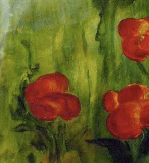 The painting above, “Red Blooms” was created while I was on Leslie’s back patio working and gazing out onto her backyard which is laden with trees and brightly colored flowers. This piece is for sale. it measures 12″W x 25″H and is painted in transparent acrylics which allow the colors to glow. You can purchase this painting here