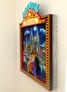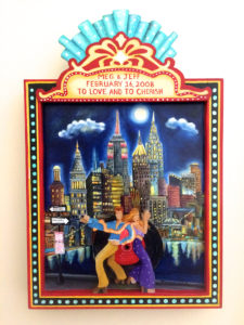 In the First week of February I received a request, from Jeffery Newton of Stamford Connecticut for a special painting to mark his 10th wedding anniversary. Jeff wanted to surprise his wife Meg with a unique gift that would mark their first 10 years of marriage. He shared with me that they loved to dance while dating in NYC as well as visiting the Chrysler Building. Together Jeff and I discussed several possibilities that the painting could take. Soon it became clear to me how I might compose the painting with Jeff and Meg as the central figures. I envisioned them dancing on a boardwalk in front of an evening New York skyline. Jeff suggested the disco clothes and the LP record behind them. As you can see I included some of the historic NY buildings and the Brooklyn Bridge. Can you find the Chrysler Building in the painting? The figures of Jeff and Meg and the outline of the marque are all one piece of wood that was cut out and mounted onto the 14W x 18H x 2D panel box. This gives the painting a 3 dimensional element. Best wishes to you Meg and Jeffery as you journey together towards another 10 grace filled years of marriage. Keep on dancing.