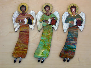 The Lark Art Gallery, in Sedona, Az, specifically asked me to create new angel ornaments for them that would reflect our diverse multicultural population. They also wanted angels playing instruments. So I tried a variety of new hair styles and skin tones on these angels. Can you see your ethnic background in any of these angelic faces? I also included several different musical instruments. I’m calling this unique group, “A Heavenly Band of Angels”. I’m glad that this order prompted me to stretch and to think in a broader sense about our heavenly ethnic friends.