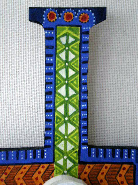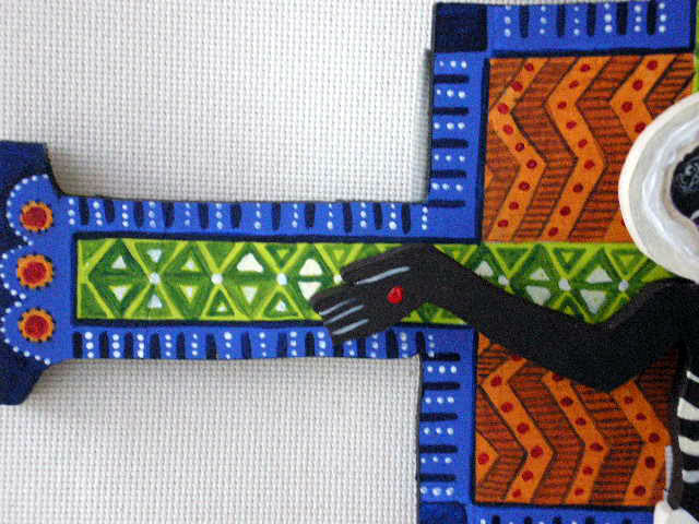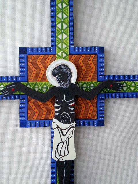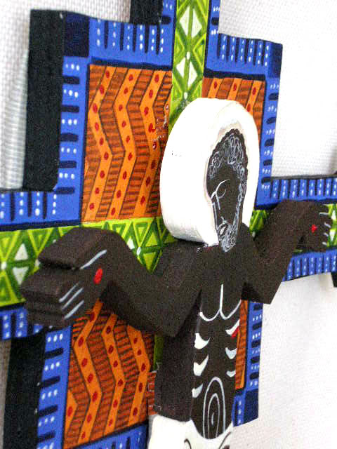 The wooden African Crucifix is hand painted in acrylics and measures 15 inches wide x 22 inches H.