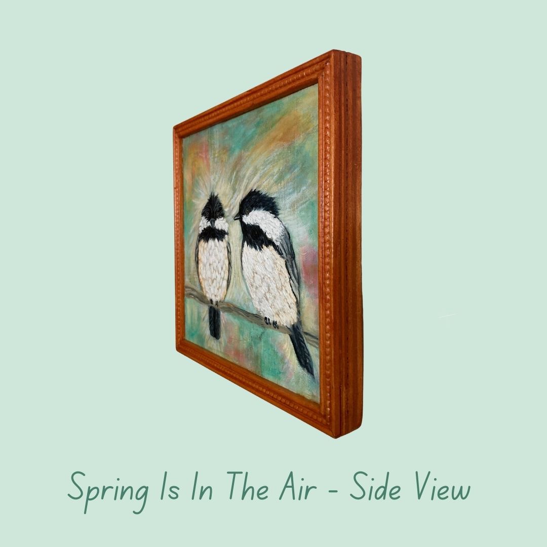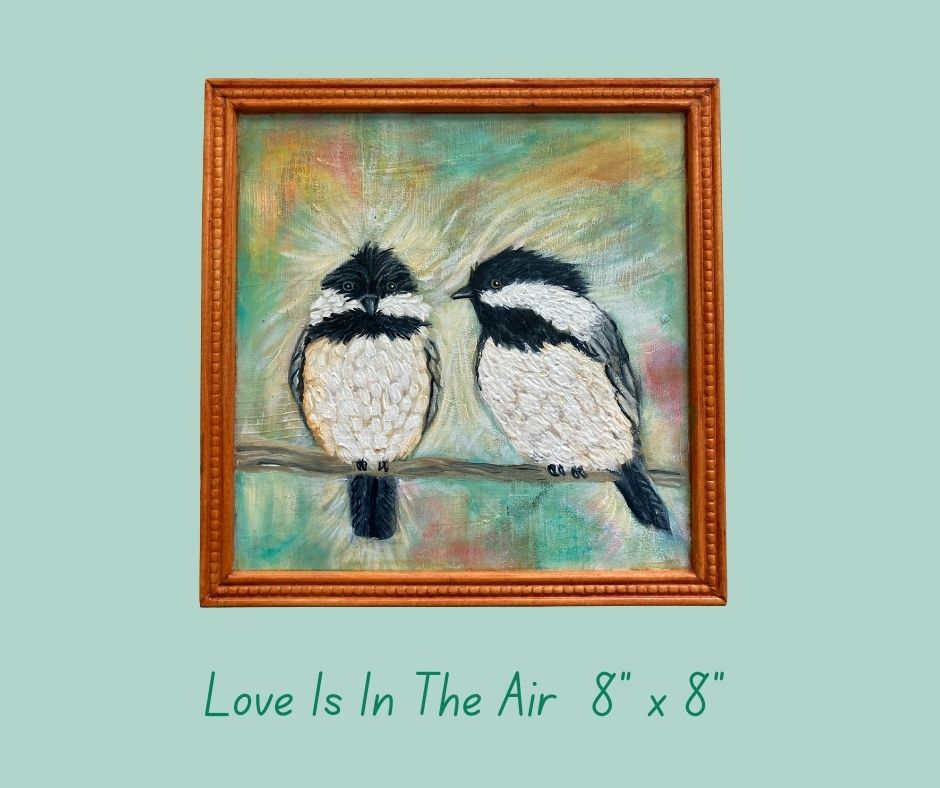 Love Is In The Air captures a tender moment between two Black-capped Chickadees perched on a branch. The male gazes intently at the female, his posture full of charm and devotion. Around them, lively, colorful brushstrokes swirl—expressing the energy and joy of mating season. Soft hues of aqua, golden yellow, pink, and white create a dreamy backdrop, adding warmth and light to the scene. Measuring 8" x 8", this expressive painting is varnished to a gentle glow, set in a light brown frame, and ready to hang. These two birds in love are a perfect piece to bring a touch of affection and color to your space.