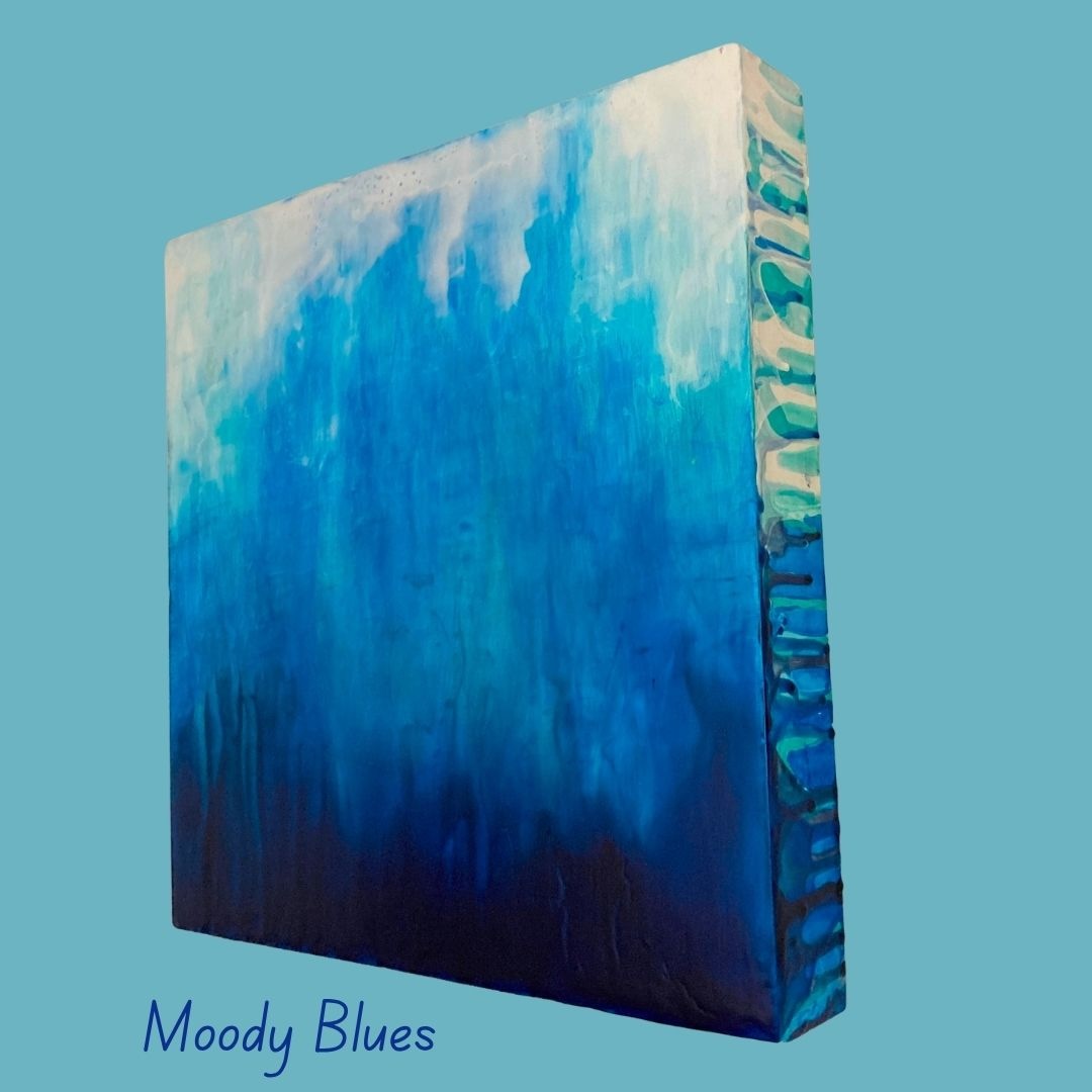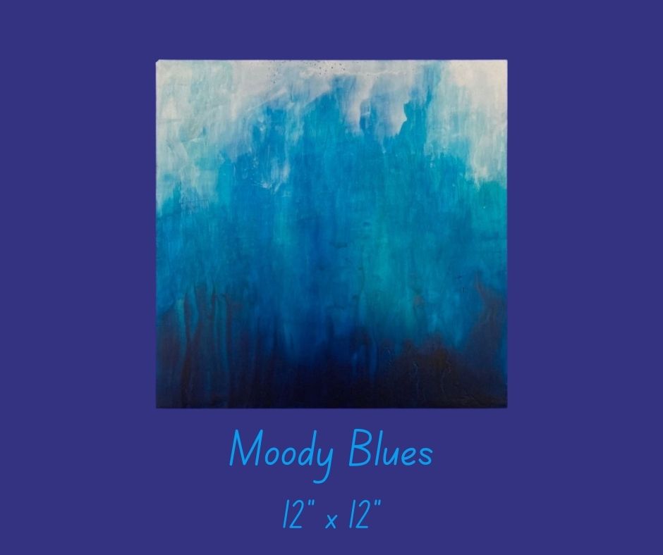Moody Blues is an acrylic painting on a 12 x 12 inch wooden panel. This piece is an exploration of the color blue and its various shades. The paint has been allowed to drip over the sides, creating interesting mixes of blues, and whites.