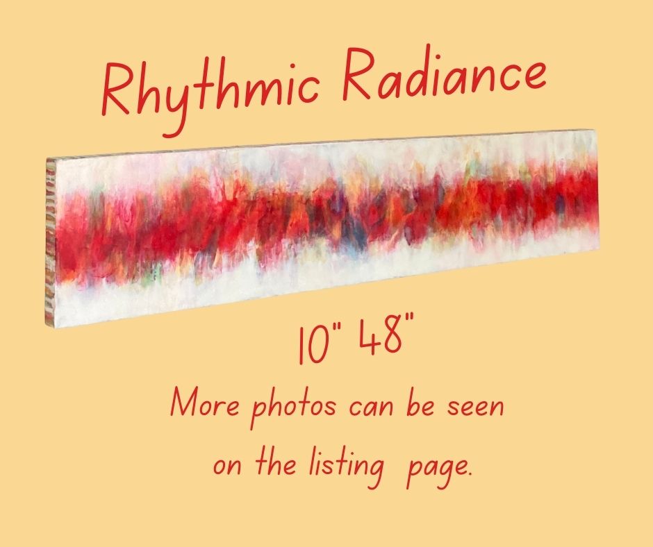 Rhythmic Radiation is an acrylic painting on a10 x 48-inch wooden panel. This long and narrow artwork represents the energy and spirit that resides within each of us. Energy pulsates at high and low frequencies, reflecting the highs and lows we experience in our daily lives. This dynamic range makes being human both a challenge and an exciting adventure.