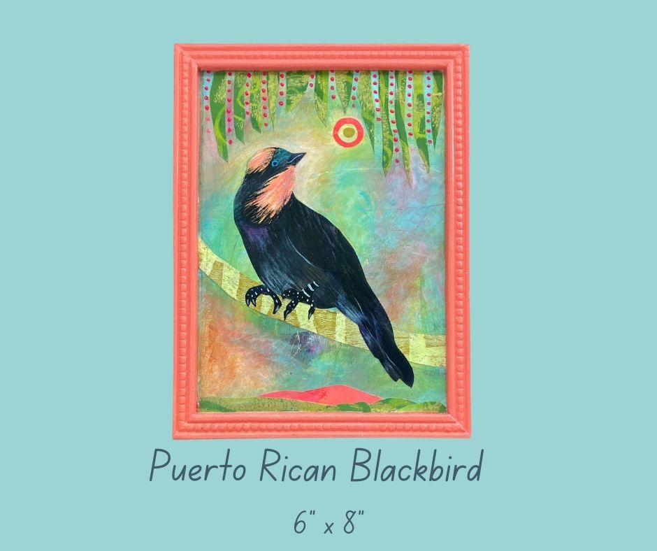 “Puerto Rican Black Bird is an acrylic painting with collage elements that capture the energy and vibrance of this striking bird.