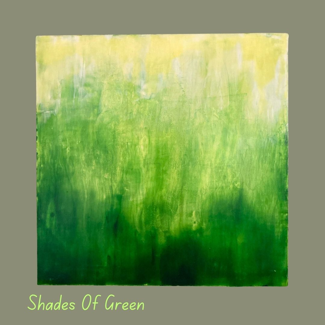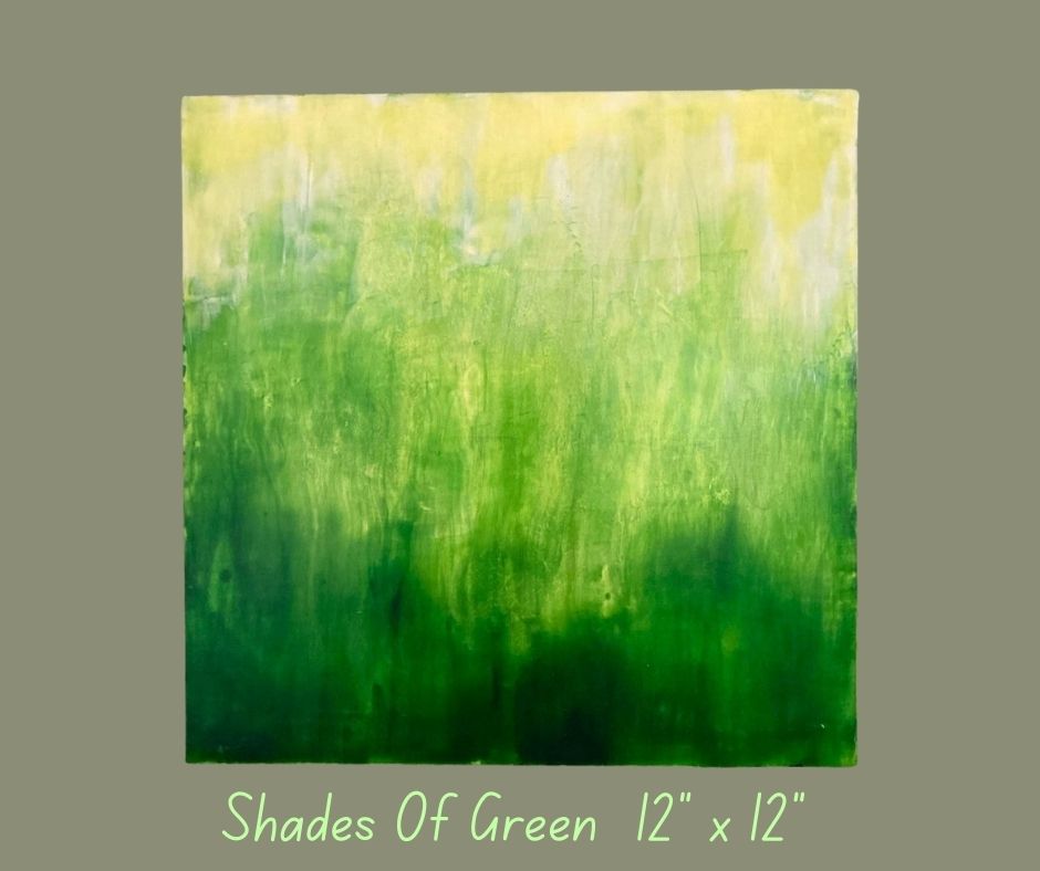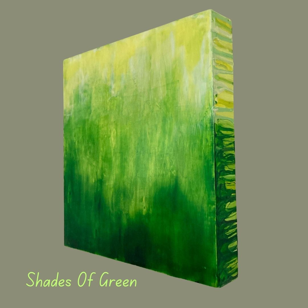 Shades Of Green is an acrylic painting on a 12 x 12 inch wooden panel. This piece is an exploration of the color green and its various shades. The paint has been allowed to drip over the sides, creating interesting mixes of greens, and whites.